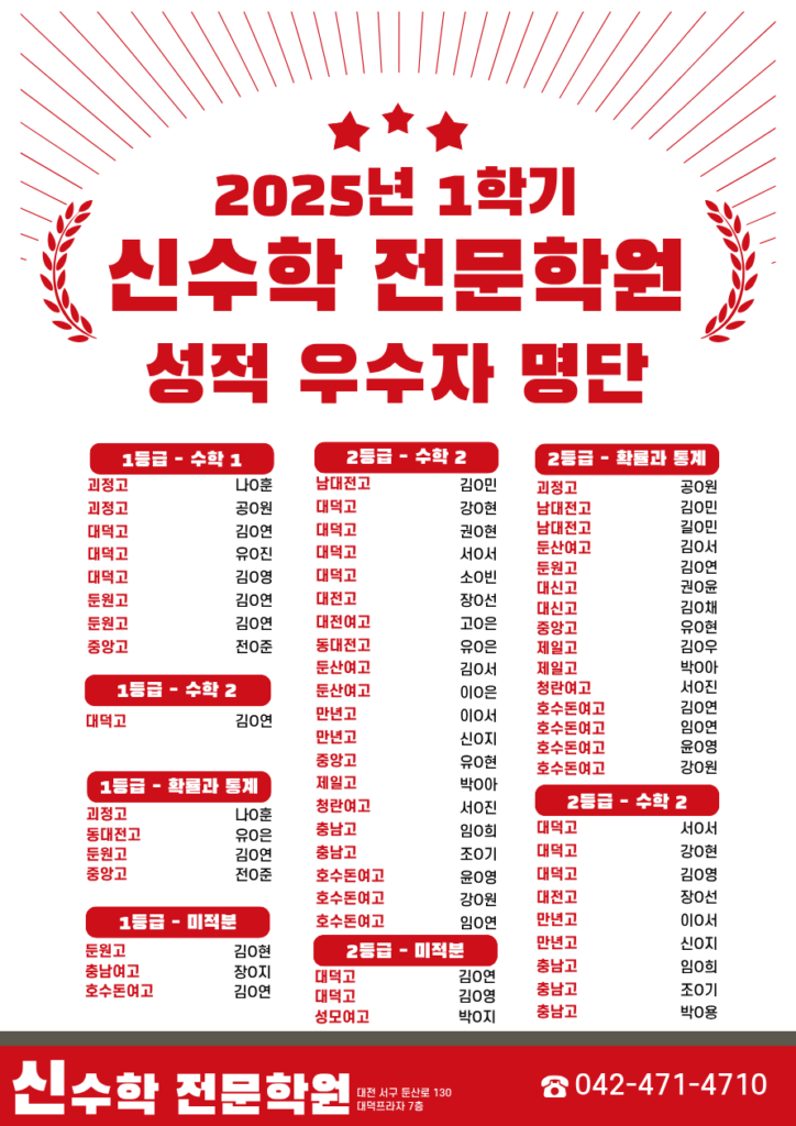 명예의 전당 프리미엄 소수 정예 관리형 수업, 신수학전문학원입니다. 2025년 2학기 중간고사 성적 우수자 명단 2025-11-12 2025년 1학기 전체 성적 우수자 명단 2025-11-07